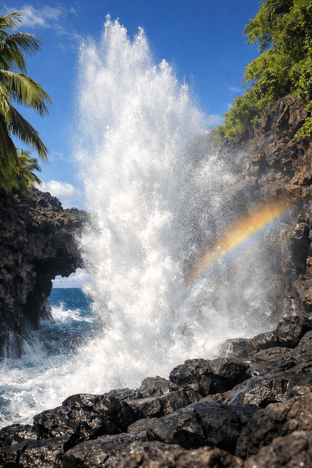 On Tahiti’s north coast, the Arahoho Blowhole is a free, roadside attraction that genuinely earns its reputation [1][5][7]. Waves crash into underwater lava tubes and shoot skyward through rock openings — sometimes reaching 20 feet or more. It’s one of those sights that stops you mid-sentence.