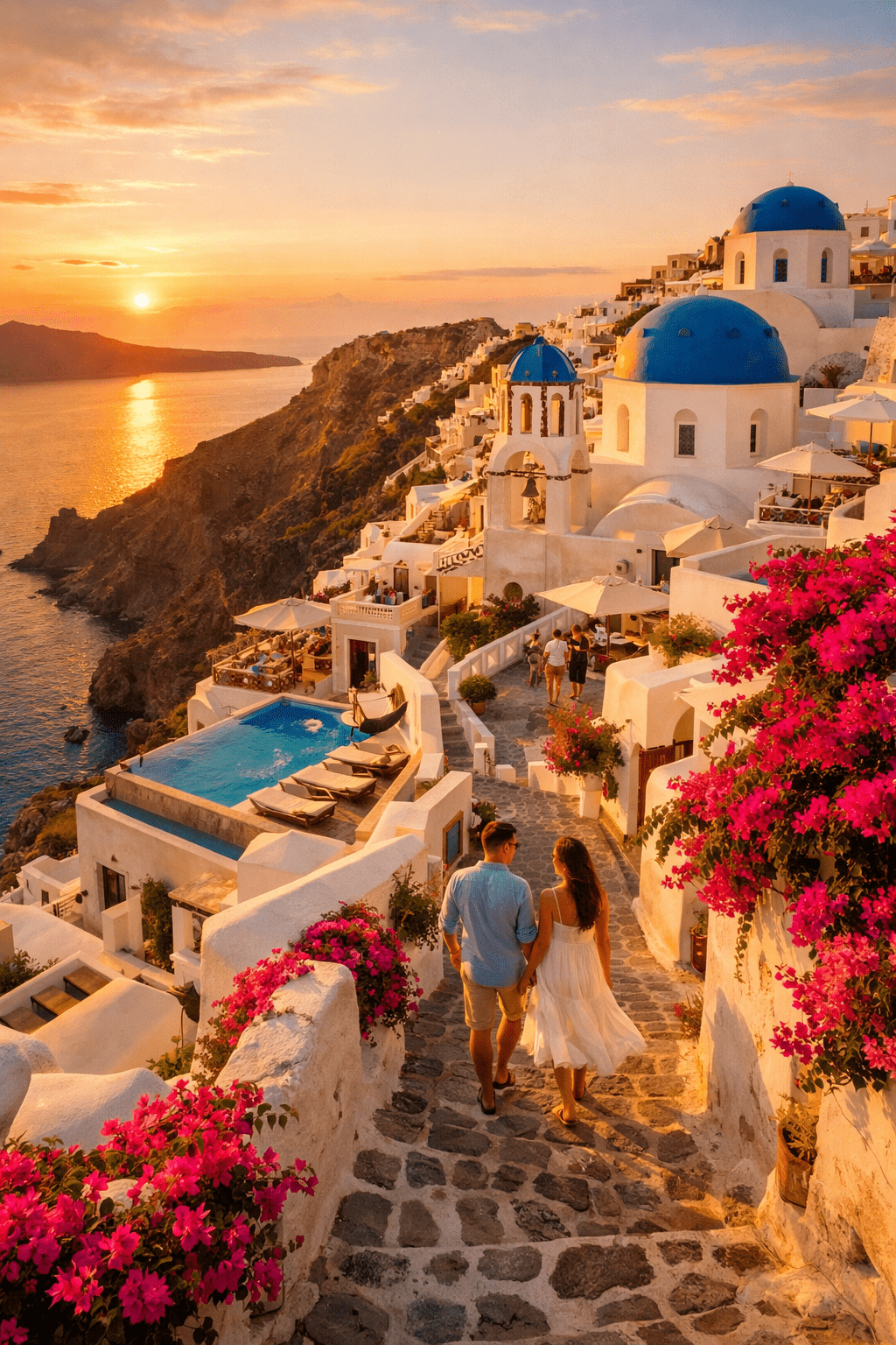 Romantic activities: Wine tasting at volcanic wineries, sailing around the caldera at sunset, exploring the ancient ruins of Akrotiri, or simply wandering the narrow pathways discovering hidden cafes and viewpoints.