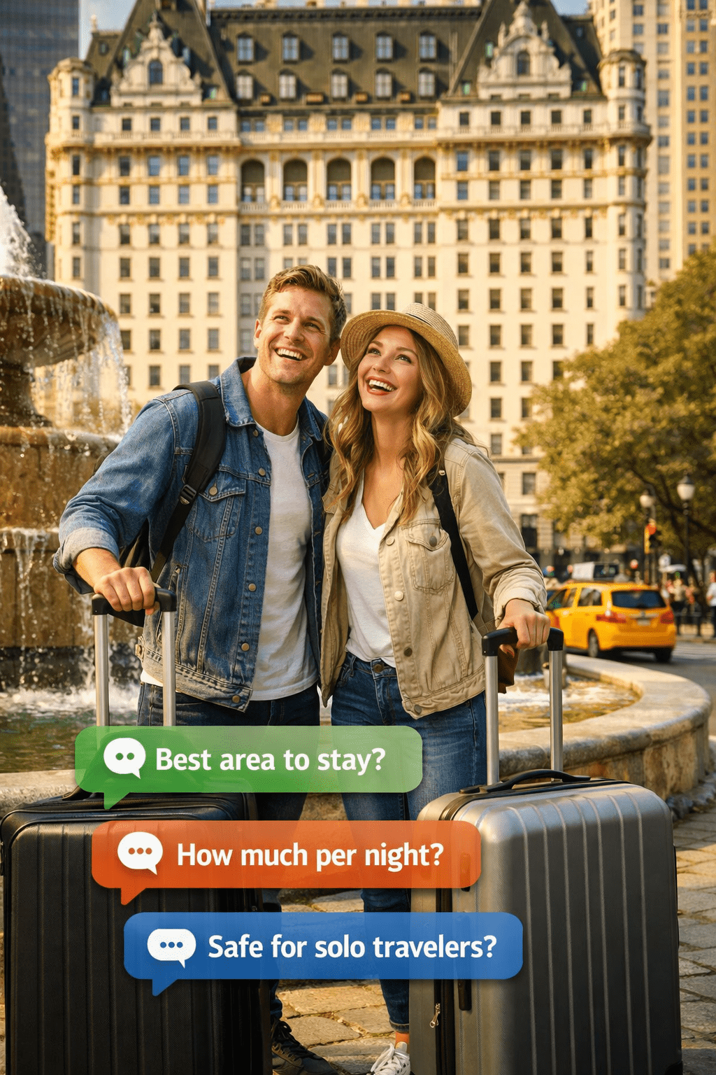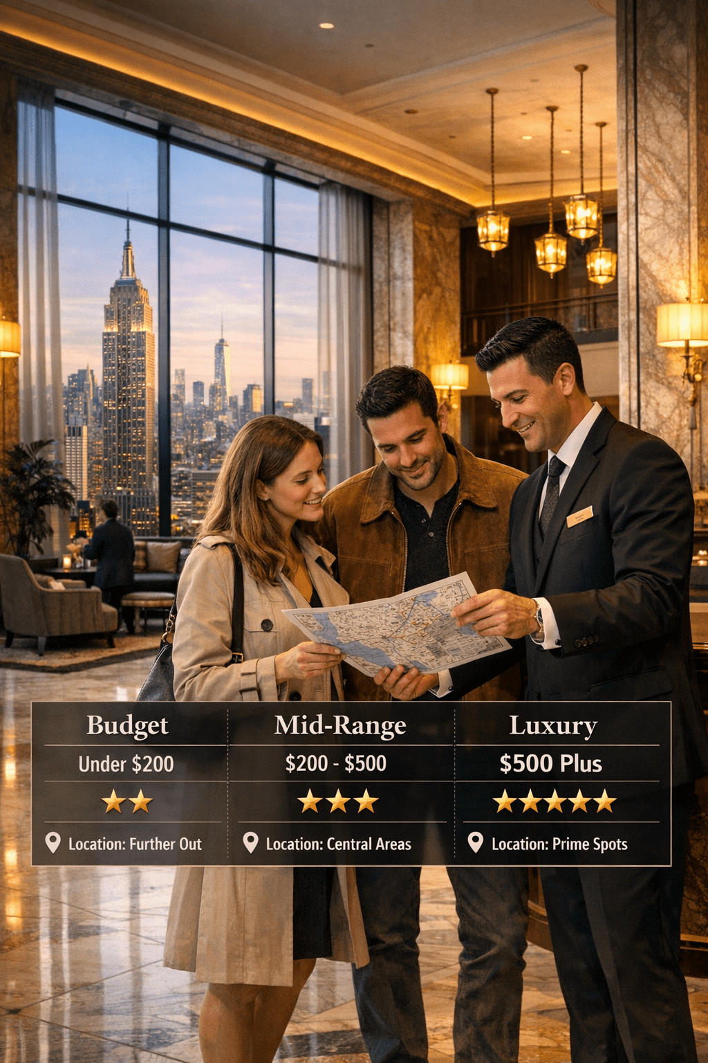| Midtown Manhattan | Everyone | $150–$300/night | Times Square, Central Park, 5th Ave |