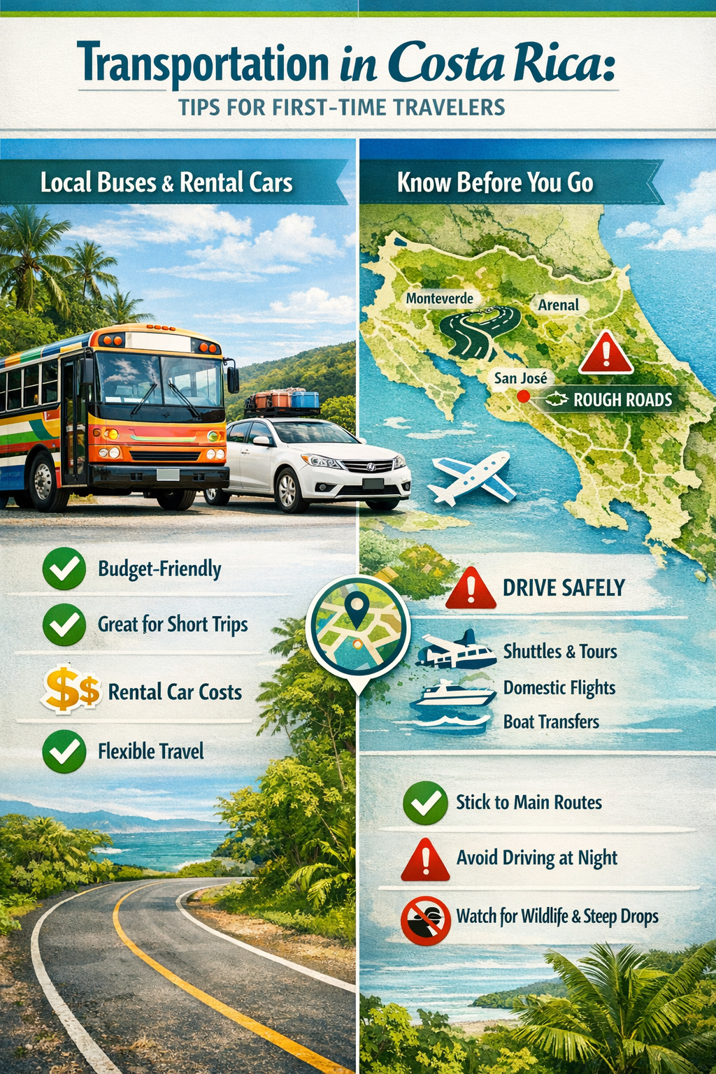 Public buses are the most affordable way to travel in Costa Rica, connecting major destinations for just a few dollars per trip[1]. However, your transportation choice should match your itinerary and comfort level.