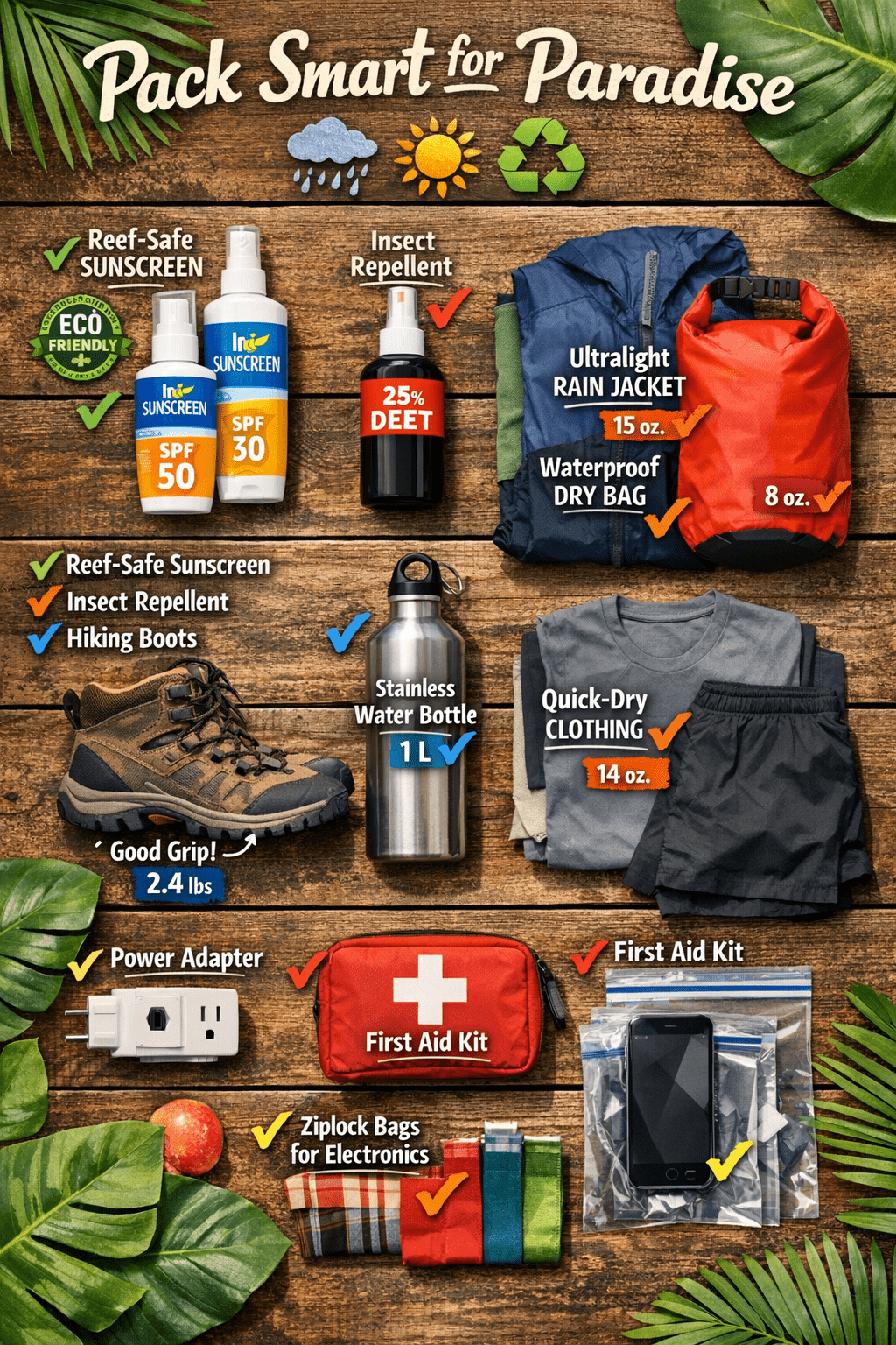 - Create a comprehensive packing list with reef-safe sunscreen and rain gear